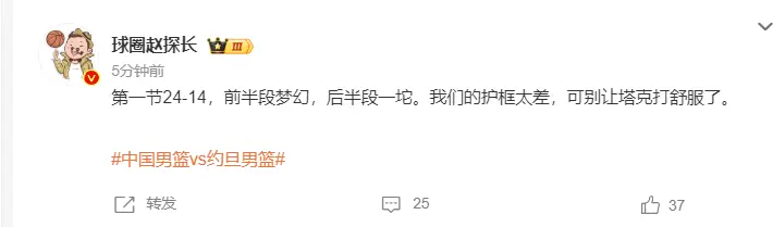 博主:赵睿是这支男篮的定海神针,第二节单节11分命中两个三分,作用太大了。