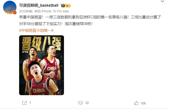 FIBA亚洲杯官方晒出胡金秋的海报写道:中国男篮已经锁定了1/4决赛的席位。