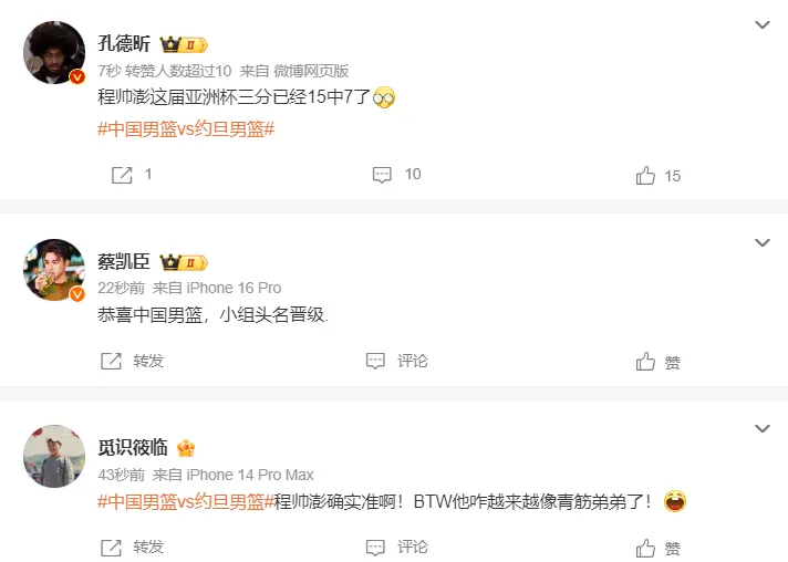 末节程帅澎成为直接击溃约旦的超级奇兵,他三分4中2拿到9分,中国队也将分差拉开到20分,约旦率先放弃比赛,孔德昕:程帅澎这届亚洲杯三分球15中7了,程帅澎太准了。