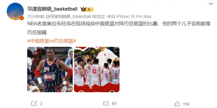 这场比赛NBA名宿(我火队史第一人)哈基姆-奥拉朱旺现场观战中国VS约旦,因为他有两个儿子都在这支约旦男篮之中。