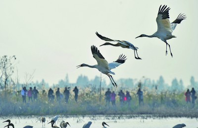 人们在江西鄱阳湖畔鲤鱼洲观察拍摄白鹤。新华社发